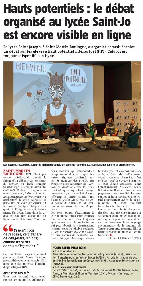 « Mon fils Alexandre était HPI et hypersensible. Il est décédé à l’âge de 20 ans, le 12 décembre 2022 suite aux conséquences parfois dramatiques des comportements à risques (pièce de théâtre débat ADRENALINE auprès des jeunes de St Jo le 11 décembre dernier). Comme grand nombre de HPI, il était en souffrance et a déclenché une phobie scolaire en 2017. La méconnaissance des professeurs de l’éducation nationale du fonctionnement intellectuel de cette catégorie de personnes, en était principalement la cause. A l’heure actuelle, connaissons-nous le nombre de HPI au sein des établissements scolaires ? Sont-ils en souffrance ?Que le décès de mon fils, puisse permettre d’ouvrir le débat afin de trouver des solutions à cette souffrance et ainsi faciliter ces jeunes à vivre plus sereinement leur parcours scolaire. »